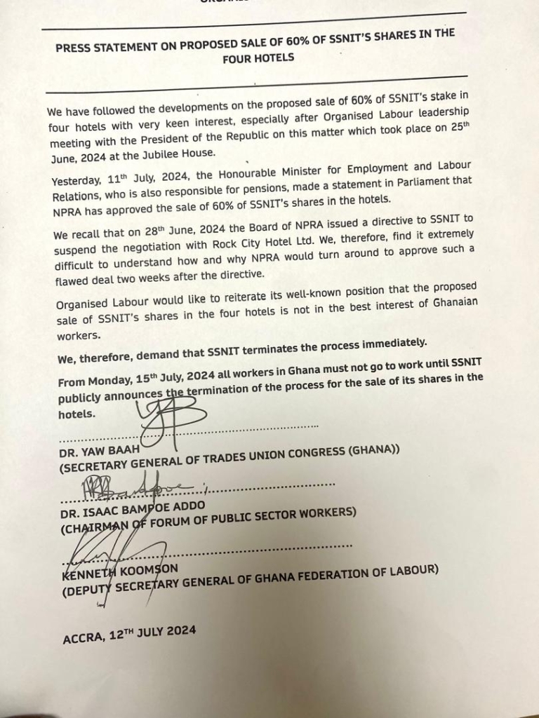 Addressing the media on July 12, Dr Baah said “From Monday 15 of July 2024, all workers in Ghana must not go to work until SSNIT publicly announces the termination of the process for the sale of its shares in the hotels.” The union argued that the sale of SSNIT’s stake to Rock City Hotel was not in the best interest of Ghanaian workers; therefore, SSNIT must terminate the deal.
