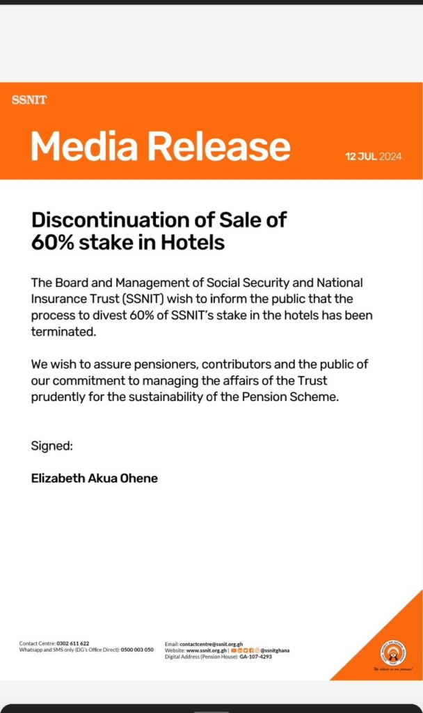 A statement from SSNIT issued just before midnight of Friday, July 12, came hours after the Minister’s firm, Rock City Hotel, also announced that it had pulled out of the transaction due to the massive opposition by stakeholders.