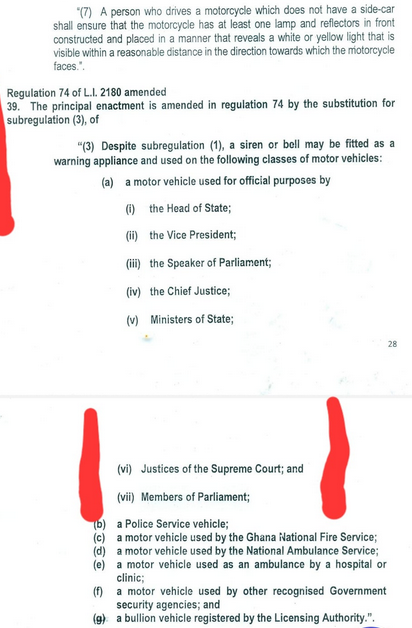 The amendment of Regulation 74 of LI 2180 will now permit the fitting of sirens or bells as warning appliances on specific classes of vehicles, including those owned by justices of the Supreme Court, Members of Parliament, and Ministers of State.