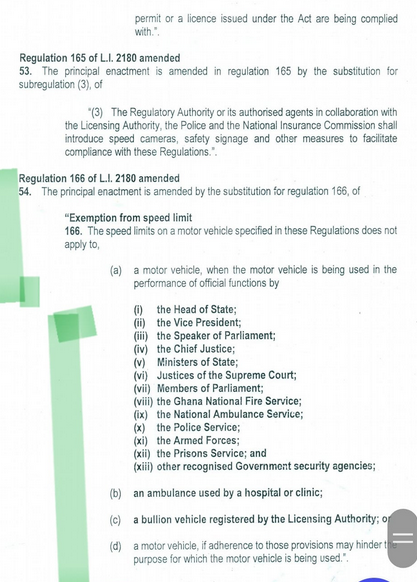 Additionally, an amendment of Regulation 166 of LI 2180 indicates that speed limit regulations will no longer apply to MPs and Ministers of State.