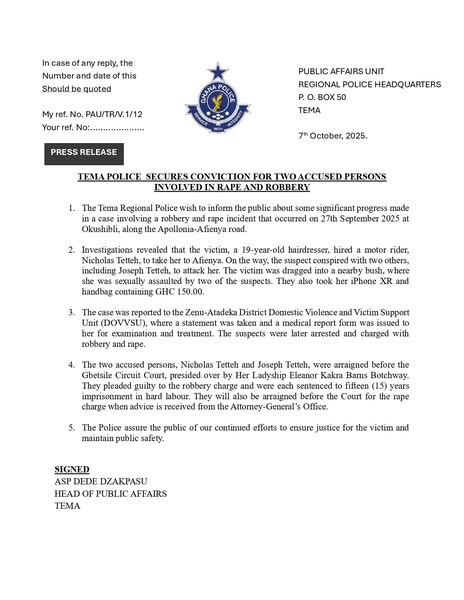 The Tema Regional Police Command has secured a 15-year jail sentence each for two men involved in a robbery and rape case that occurred on September 27, 2025, at Okushibli, along the Apollonia–Afienya road.