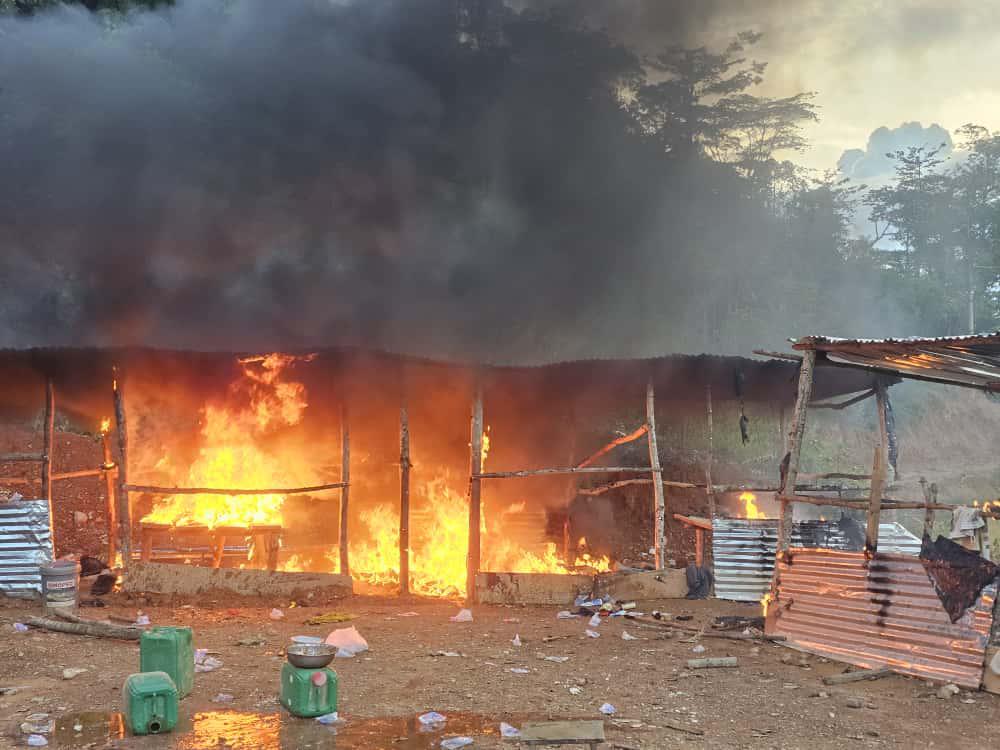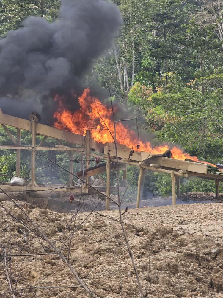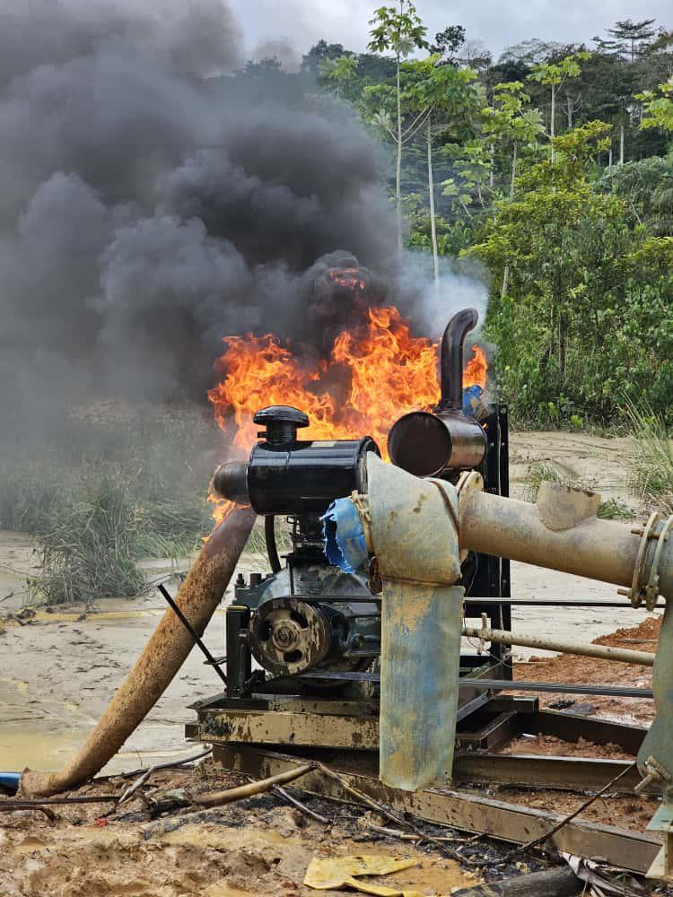 The team found four excavators—three already immobilised and one disabled during the operation. They also uncovered evidence of river diversion, two heavy-duty water pumps, and 12 makeshift mining structures, all of which were destroyed on-site.