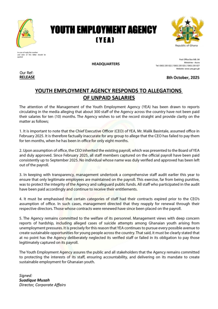 In a statement issued on Wednesday, October 8, and signed by the Agency’s Director of Communications, Suadique Musah, YEA described the allegations as “factually inaccurate” and provided detailed clarification on the issue.