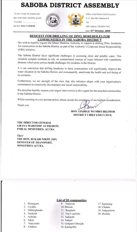 The Saboba District Assembly has formally requested support from the Ghana Maritime Authority (GMA) for the drilling of 20 mechanised boreholes across selected communities in the district, as part of the Authority’s Corporate Social Responsibility (CSR) initiative.